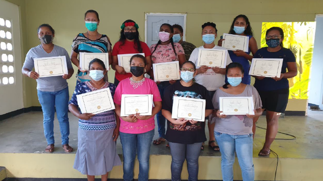 Participants were selected from the villages Casipora, Pierrekondre, and Powakka. They were selected based on their gender(female) and their will to participate in this project for one year. 18 female participants completed training sessions. The chairperson of the Whe-Khalwawetjie foundation handed over the certificates to the participants.